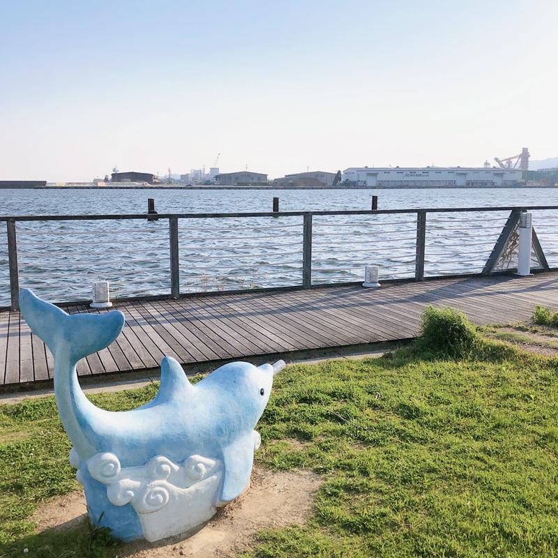 ひとけのない静かな海沿いにたたずむイルカさんがなんともシュールです🐬