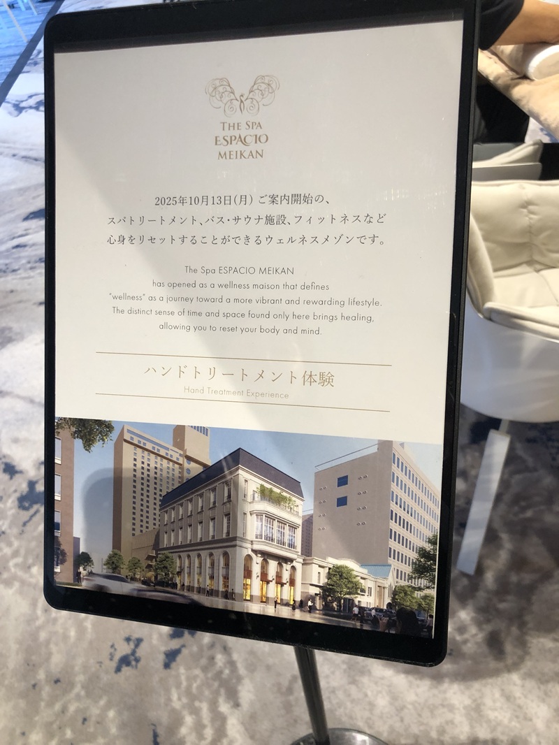 このあとお部屋のルームキーをもらうためカウンターに寄ろうとしたとき、ラウンジの一角でハンドマッサージをしてもらっている方が目に留まり。。。