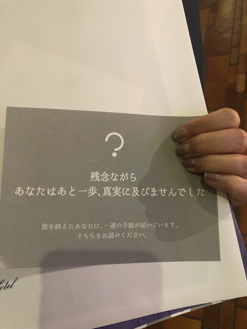 ちなみに降参した時点で謎解きの答えの封筒を受け取っていますが、わたしたちは翌日もチェックアウトまでがんばろう!と決めたので答えは開けないままにしました。