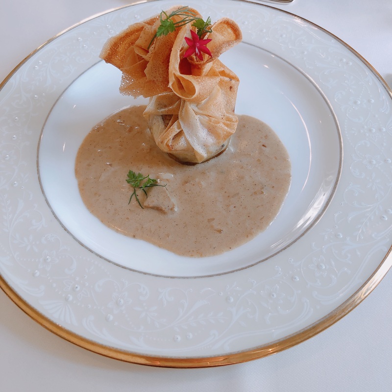どの料理もほんとうにすばらしくて、その中でも特に「イトヨリ鯛と甘エビのオモニエール ポルチーニ茸のクリームソース」が忘れられないくらいおいしかった。。。